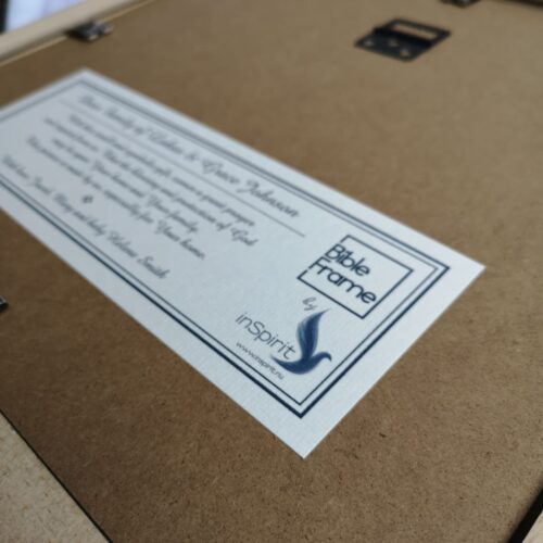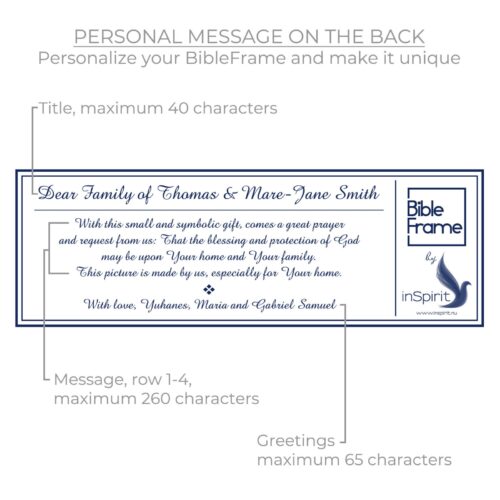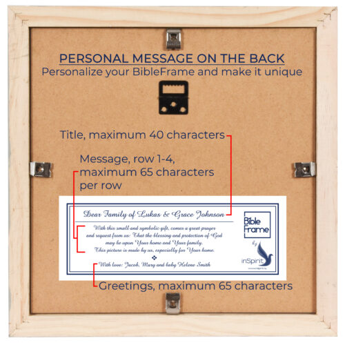 Personalize your own BibleFrame with the personal message fields. Make it either as a special memory to yourself, your home or your family – or as the best gift with a splendid message to its receiver!