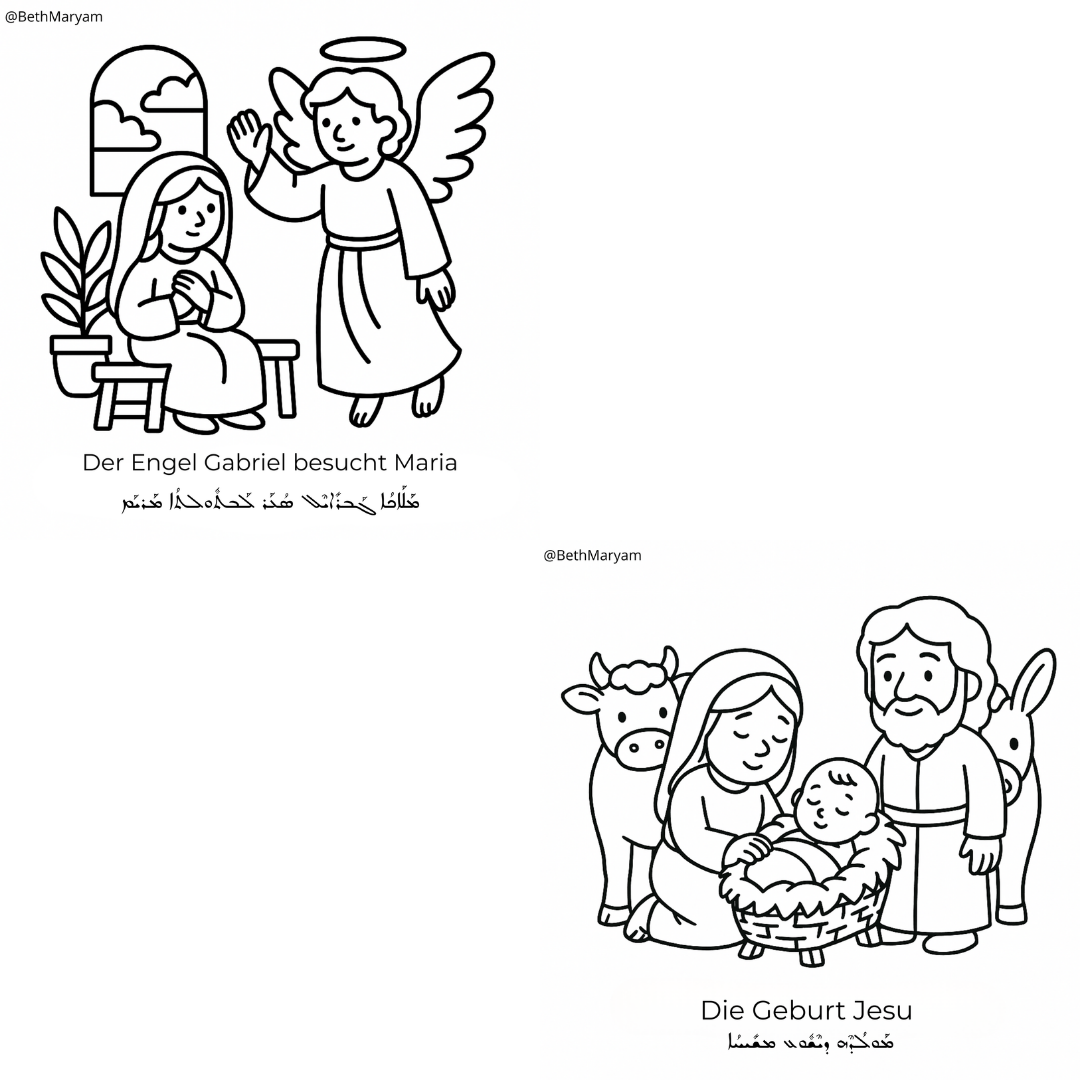 Snuggle up with this meaningful Christmas colouring book and let little ones explore the Nativity story through simple, charming illustrations they’ll love. With Suryoyo (SYR) and Deutsch (DL) text on every page, children can learn, colour, and grow in faith all at once!