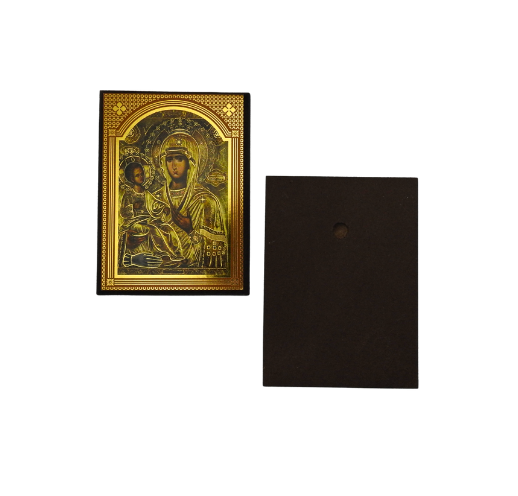 The icon is mounted on a sturdy base and is suitable for placing on a table, shelf, or small altar. Thanks to its small dimensions, it is also ideal for travel, workspaces, or bedside devotion.