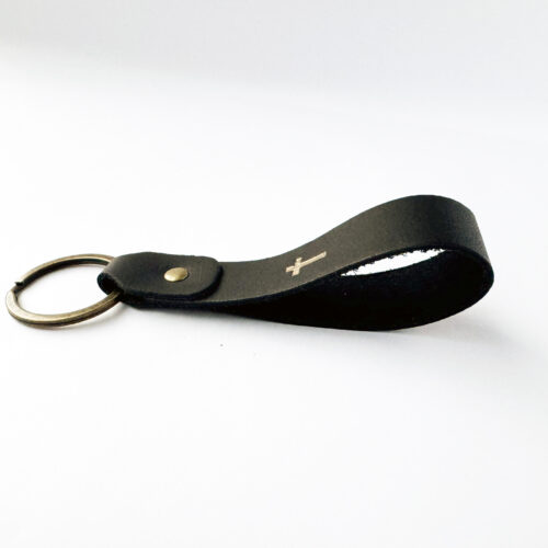 Key ring made out of real leather – colour black – with brass metallic ring and pin.